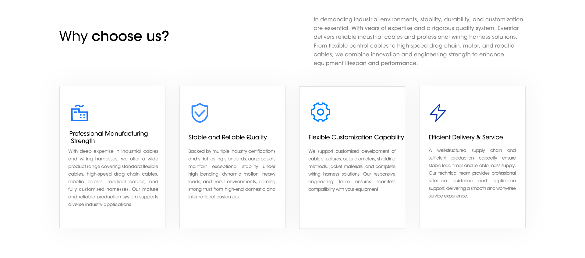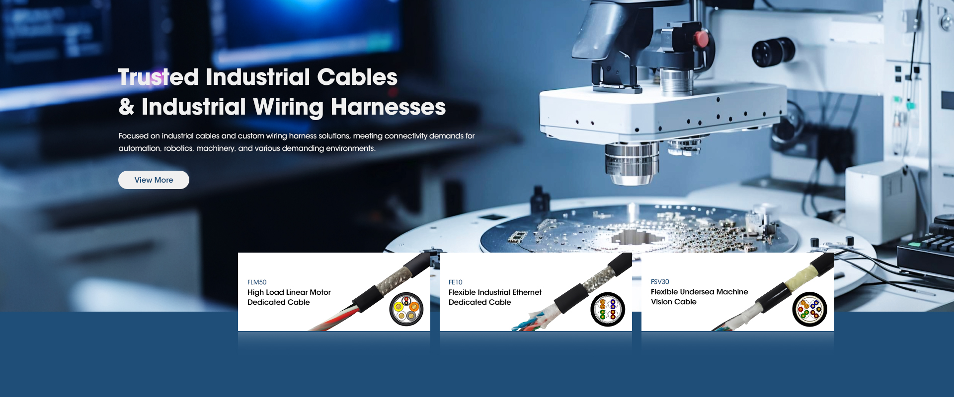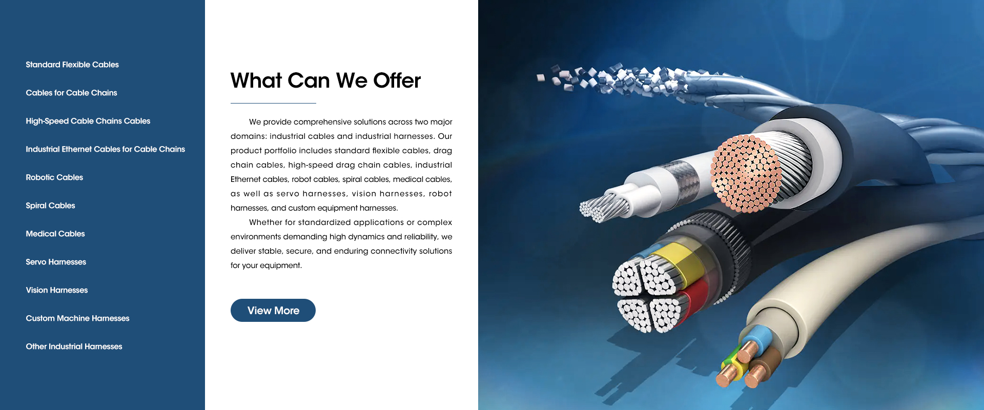 Tailored cables for high-speed drag chains, torsion, oil resistance, chemicals, low-temperature and underwater vision applications.